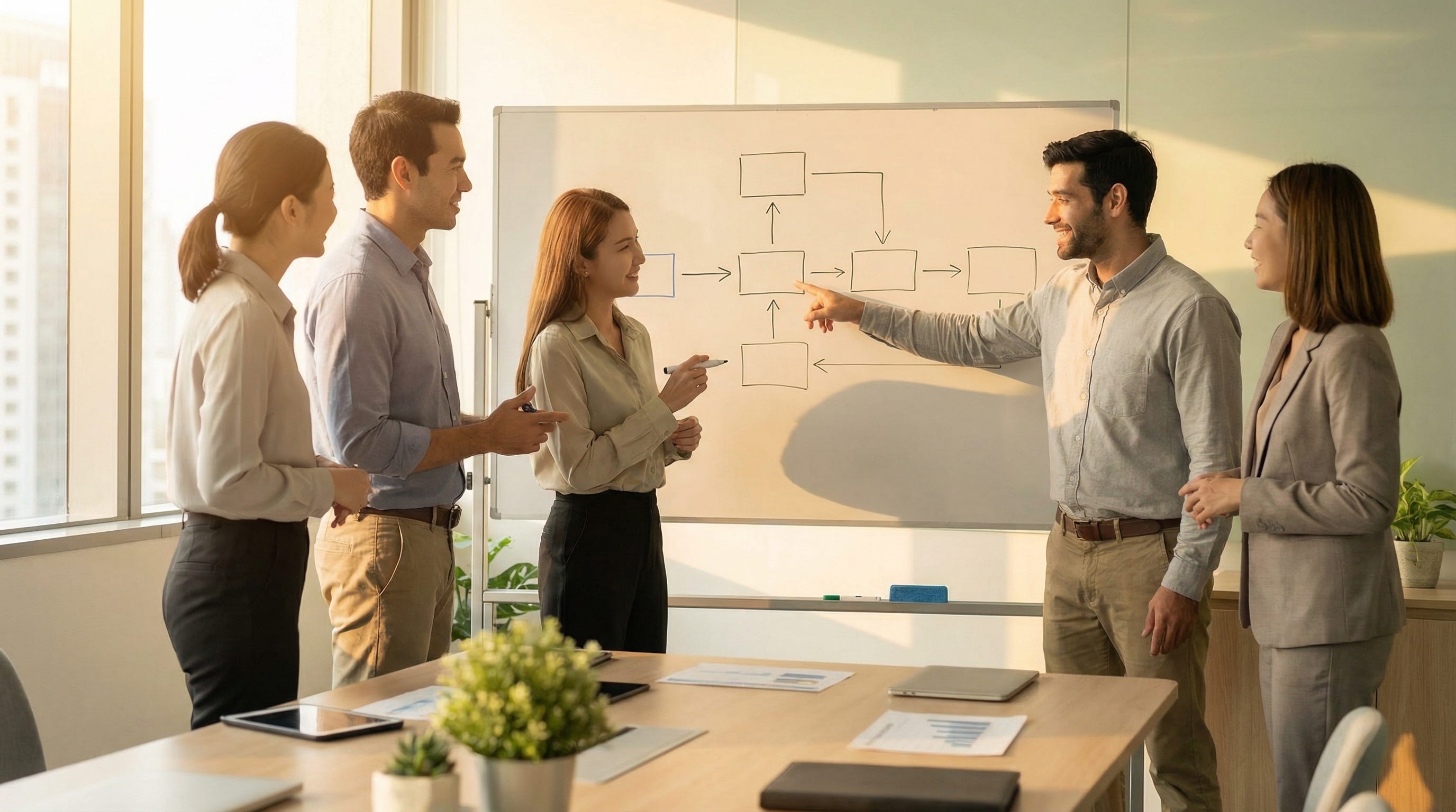 Draw the system. Create a simple flow diagram showing how work moves across departments. Clarity reveals waste, rework, and misalignment.